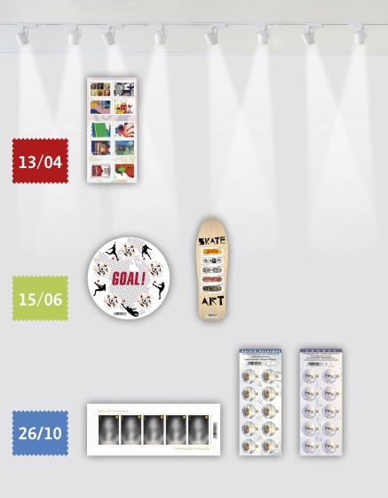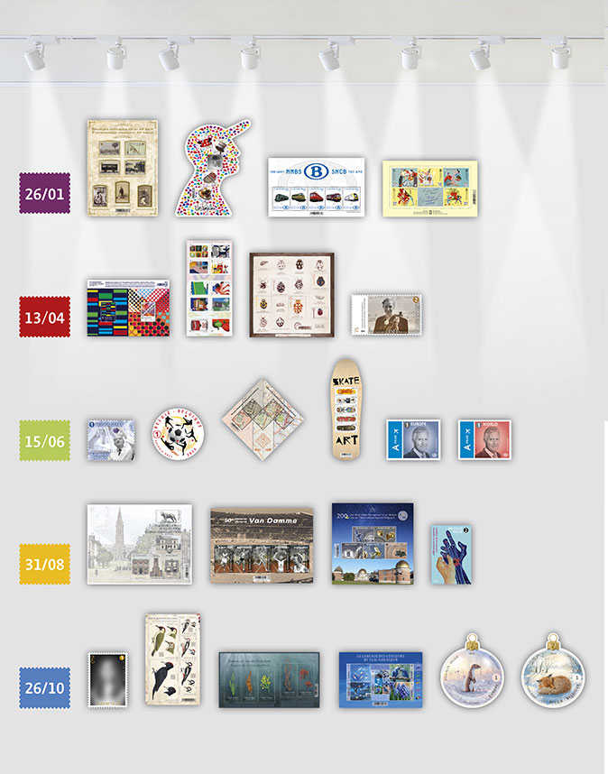 1 exemplaar van elke postzegel van de voorziene uitgiften, van de gegomde en zelfklevende postzegels.