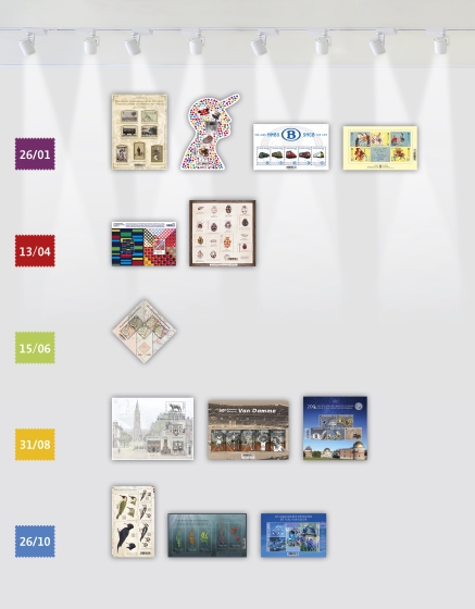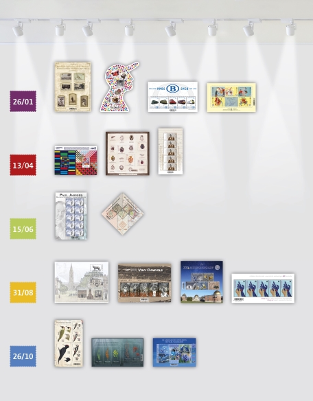 1 exemplaar van elke postzegel van de voorziene en onvoorziene uitgiften*, van de gegomde en zelfklevende postzegels.